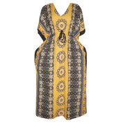 Women Maxi Caftan Yellow Printed Cotton Beach Cover up Kimono House Dress