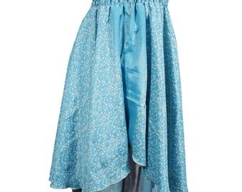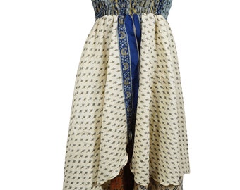 Women Floral Skirt Dress, Summer Blue Beige Hi Low Dresses, 2 in 1 Recycled Sari Bohemian Beach Dresses S/M
