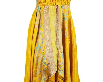 Boho Sundress Printed Yellow Handkercheif Hem Recycled Sari Holiday Beach Dress S/M