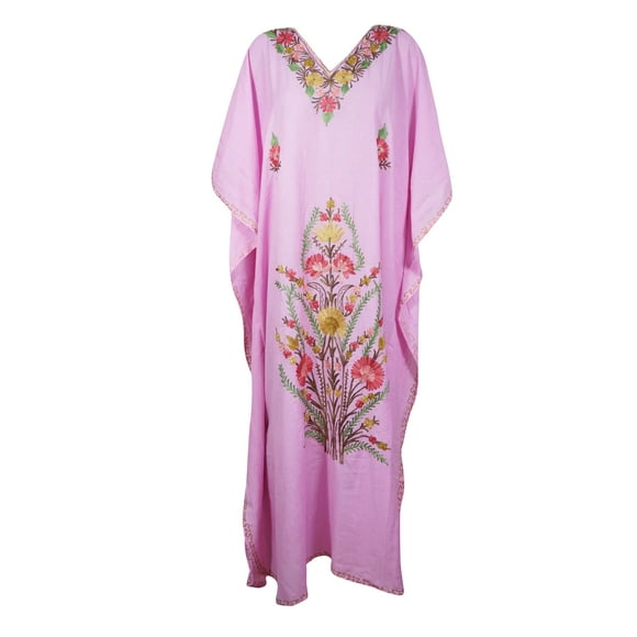 Mogul Women Baby Pink Floral Maxi Kaftan Dress White HAND Embroidered Kimono Sleeves Resort Wear Housedress 3XL