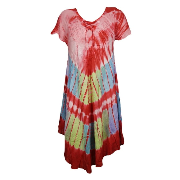 Mogul Women Tie Dye Red Dress Loose Flared Holiday Beach Cover Up Holiday Dresses L