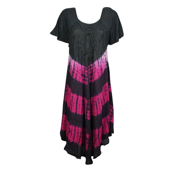 Mogul Women Tie Dye Pink Black Dress Loose Flared Holiday Beach CoverUp Dresses L